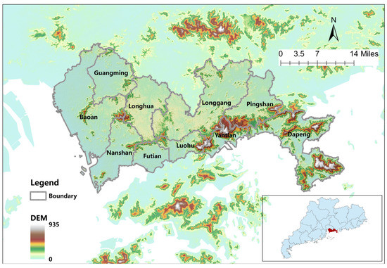 Shenzhen, an important city along China’s southern coast, is in the southern region of the Guangdong Province and on the east coast of the Pearl River Estuary, as shown in Figure 1. As one of the four central cities in the Guangdong-Hong Kong-Macao Greater Bay Area, Shenzhen was the first city in China to undergo reform and open up [36]. The city has a land area of 1997.47 km2 [36], of which 1005.95 km2 is built-up land, and has a year-end resident population of 17,681,600 (as of the end of 2021). In the context of continuous industrial development and transformation, the local soil environment has gradually deteriorated with the influx of population and the continuous reduction of nonecological space land; it has more-serious environmental problems, such as soil hardening and slabbing, soil acidification, soil salinization, and soil pollution [37,38]; and the supply base of ecosystem services has been challenged. Shenzhen is a southern subtropical monsoon climate zone characterized by high temperatures and rainfall in summer and mild winters, with high annual rainfall [39]. An overly fragile surface soil environment can cause serious erosion, surface runoff, and surface source pollution problems when washed by precipitation [40].