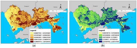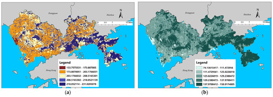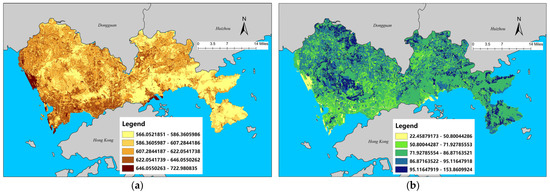 The distribution characteristics of the supply capacity of TN reduction services and TP reduction services in Shenzhen’s ecological space are more consistent across the city. The areas with higher supply capacity are distributed mainly in the large mountain woodlands in the eastern part of the Dapeng Peninsula–Pingshan District–Yantian District–Luohu District contiguous area and in the Tanglang Mountain, Yangtai Mountain, and Fenghuang Mountain areas. On the other hand, urban green spaces with smaller slopes and lower-quality vegetation have lower supply capacity.