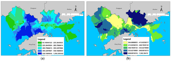 The areas with a higher supply of surface source reduction services in Shenzhen are distributed in the contiguous mountains with better vegetation cover conditions, along Dapeng New District–Pingshan District–Yantian District–Luohu District, followed by the Tanglang Mountain, Fenghuang Mountain, and Yangtai Mountain areas in the east (see Figure 9). Longgang District and Dapeng New District had higher physical quantities of TN service and TP service for surface source reduction, reaching 4399.80 t and 3247.69 t and reaching 7043.18 t and 7296.23 t, respectively, while Futian District and Guangming District had lower physical quantities of the two indicators (see Table S3). In terms of supply intensity, the Luohu, Yantian, and Futian districts have higher service averages for TN reduction from surface sources, at 0.26 t/hm2, 0.20 t/hm2, and 0.17 t/hm2, respectively. The Pingshan, Yantian, and Luohu districts have higher service averages for TP reduction from surface sources, at 0.30 t/hm2, 0.28 t/hm2, and 0.28 t/hm2, respectively.