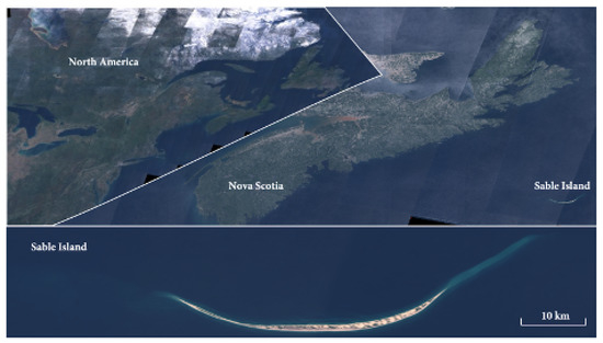Location of Sable Island in the Grand Banks region of the North Atlantic Ocean (top). Sable Island is shown in the inset (bottom). Images were taken by the Sentinel-2 multispectral satellite.