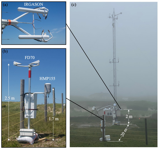 Photos of the IRGASON (a) and the FD70 with an attached HMP155 (b). The IRGASON is mounted on a measurement tower at a height of 2 m, and the FD70 is located 20 m west of the measurement tower with a measurement height of 2.5 m for and 1.7 m for (c). The figure is created by the author.