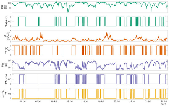Figure 3 presents the time series of , k, , and their corresponding TA series over the experimental period. Relative humidity values greater than 100% were observed and could be attributed to the reported sensor inaccuracy of . Nonetheless, the study at hand concerns only the switching across saturation, and values of 100 ± do not significantly alter the conclusions presented below. It can be seen that fog occurrence ( 1000 m) generally follows high and low k. To explore the combined effect of these two criteria, an additional “” TA series was calculated by assigning a value of 1 only when both TA and TA. Analysis of this series will be discussed below.