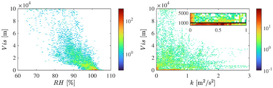 Binned scatter-plots of against and k are presented in Figure 4 with the colormap indicating the density of points. Bin sizes are 0.5% for , 0.03 m/s for k, and 400 m for . A linear fit between and yielded a coefficient of determination . In contrast, and k appear uncorrelated (). Nonetheless, the highest density of points for 1000 m occurs for low k, indicating that low turbulence levels are well correlated with fog occurrences.