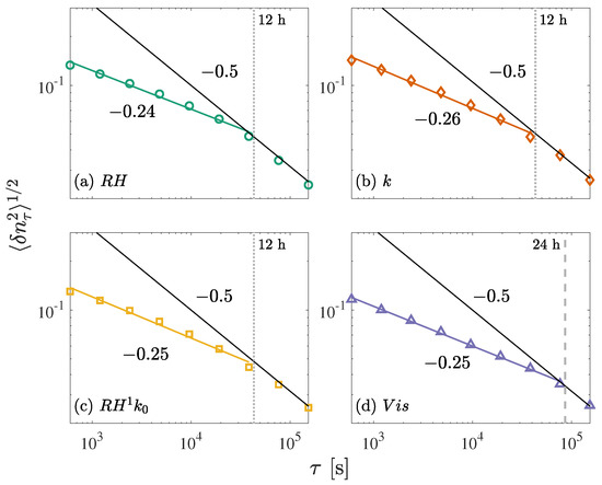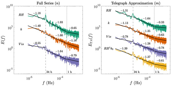 The spectra of both the original and the TA series of , k, and are presented in Figure 5. The spectrum for shows a peak at 24 h, which could arise from diurnal variation. As a result, the frequency range corresponding to 22–26 h was excluded when calculating the power laws for . A mild bump at 24 h can also be seen in the spectrum for , which could be a signature of night-time fog that disappears in the morning.