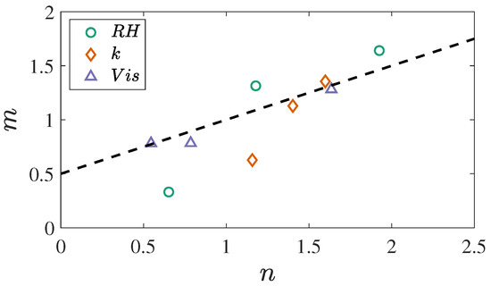 Overall, the relation between spectral exponents m and n reasonably follow Equation (3) (see Figure 6). For the slow time scales, was observed in both and , meaning that there is less “memory” in the TA series and that amplitude variations have correlating effects. For the intermediate and fine time scales (<24 h) in and , and for all time scales in k, the spectra of the TA series decay slower than that of its corresponding full series (), meaning that amplitude variations seem to have de-correlating effects at those time scales. Thus, much of the power law scaling may be due to the memory in the switching between on–off and off–on instead of the amplitude variations.