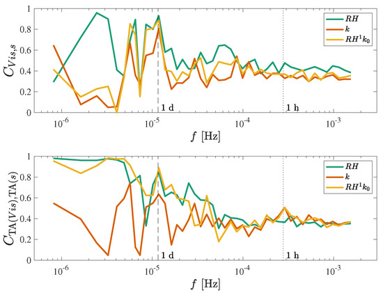 As a preliminary indicator of the extent to which variability in and k is correlated with , the magnitude-squared coherences C of the full and TA series are presented in Figure 7. In addition, the additive effect of and k in explaining is considered in calculated between and a mixed model based on the linear combination of and k (with each normalized to span from 0 to 1). Similarly, considers the coherence between TA() and the combined TA series. The coherences are smoothed through bin averaging to highlight the underlying trends.