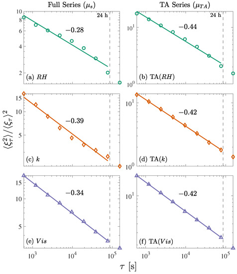 Normalized second moment of the squared temporal gradients for (a), TA() (b), k (c), TA(k) (d), (e), and TA() (f). The straight lines are best-fits that indicate the scaling laws, and the dashed vertical lines indicate a time scale of 24 h.
