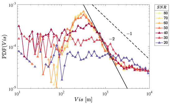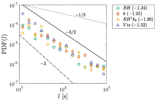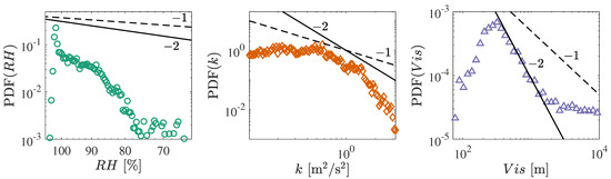 The PDFs of the signal amplitudes are shown in Figure 12 along with expected and slopes (see Table 1). The x-axis for PDF is reversed to reflect the probability of deviating from the saturation condition. Of the three variables, only PDF() exhibits a clear scaling. The scaling in occurs over the approximate range of 300–2000 m, which envelopes the condition for fog occurrence ( m). In PDF, there appears to be two regimes separated at approximately 1 m/s so that PDF for m/s followed by a power law decay at m/s. A scaling of seems to be present only for a limited range (of approximately m/s) in the transition between the two scaling regimes. In contrast, PDF has no such power law scaling.