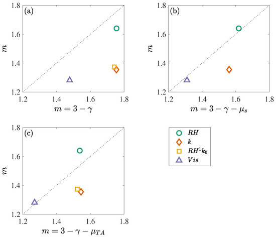 Measured spectral exponents of the TA spectra m (from Figure 5) against expected m of an SOC process near critical point (a) with intermittency corrections from the full series (b) and from the TA series (c). Dotted lines represent a slope of 1.