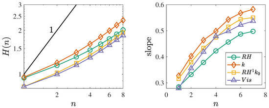 The block entropy and its growth rate with n (slope ) for the TA series are presented in Figure 13. For a sporadic process, the slope should converge to a constant value less than 1. All three variables appear to grow nonlinearly, and begin to reach a constant value between 0.5 and 0.6. In the context of block entropy, k appears to be the least ordered (most random), as it seems to asymptotically approach a slope of approximately 0.6. While these results suggest that , k, and can be described as sporadically random processes, the limited precludes conclusions on their behavior for longer time scales. It can be noted that the slope of for is bounded by that of and k at all , and that the series exhibits similar values and growth rate to .