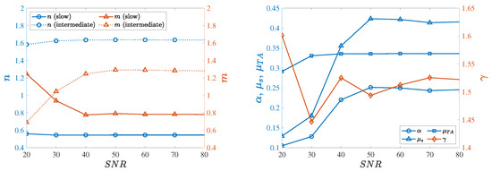 To further investigate the impact of noise to the presented conclusions, the analysis is repeated for the series with various levels of added noise. As an estimate, the for the measured series is calculated to be 86 by treating frequencies above 1/1000 Hz as white noise (in accordance with the approximate frequency, where the spectra begins to flatten). The signal-to-noise ratio of the measured signal is then progressively deteriorated by adding increasing levels of white Gaussian noise. It can be seen in Figure 14 that all scaling exponents (m, n, , , and ) are approximately constant for as low as 40. Similarly, the scaling in PDF persists for as low as 40 (Figure 15). The associated with the instrument is much higher than the at which the scaling laws no longer hold, indicating that sensor uncertainties will not impact the conclusions presented here.