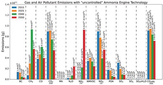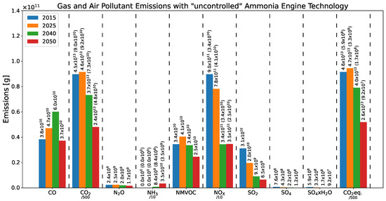In the following section, the observed emission trends in the created scenarios are explained, starting from the reference year 2015 to the three scenario years 2025, 2040, and 2050. Furthermore, a distinction is made between the “uncontrolled” and “controlled” cases, which refer to the ammonia engine technology used. However, in view of current developments, an application of a technological option similar to the uncontrolled case, but with improvements reducing (to comply with Tier III regulations), , and emissions, seems most plausible for the year 2050. The technology considered in the controlled case can presumably be expected to emerge temporally after the uncontrolled case [29]. For the uncontrolled case, the evolution of total emission levels for the scenario years considered is shown in Figure 1. For the emission species that differ compared to the controlled case, the developments are shown in Figure 2.