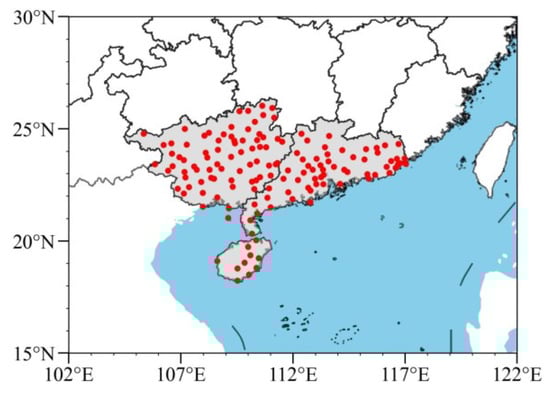 Distribution of the 140 observation stations (red dots) in South China (Guangxi, Guangdong, and Hainan provinces) considered in this study.