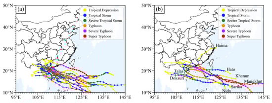 The target TCs in this study included training samples and independent samples that were used to perform simulation tests and forecast tests, respectively, and their inclusion criterion was that they must have caused severe gale impact (maximum gale: ≥17.2 m/s for at least one station) in South China, i.e., the target TCs included but were not limited to those making landfall in South China. Ultimately, 24 TCs that occurred during 2011–2018 were identified based on the selection criterion, 16 of which from 2011–2015 (Figure 2a) were selected as the training sample, and the remaining eight from 2016–2018 (Figure 2b) were used as the sample for the independent forecast test.