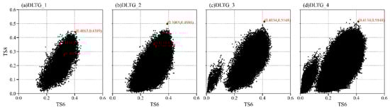 The scatter plots presented in Figure 3 show the TSs of the schemes of the four experiments for the 16 training samples. Each black dot in the figure represents a single scheme, and the horizontal and vertical axes correspond to the TS6 and TS8 values, respectively. The red dot represents the maximum value of TS6 + TS8, which is considered the best forecast scheme. DLTG_1 has the fewest schemes, whereas the number of schemes involved in the improved models increase, and DLTG_4 (adding both translation speed similarity and the five new ensemble schemes) has the greatest number of schemes. The maximum value of TSsum for DLTG_2 is 0.8891, which is higher in comparison with that for DLTG_1 (0.8451), while the maximum value of TSsum for both DLTG_3 and DLTG_4 is 0.9284 (TS6 = 0.4134, TS8 = 0.5148), but note that the number of DLTG_4 partial schemes is better than that of DLTG_3 in TS8, i.e., higher than 0.5148. It indicates that compared with the experiment adding only the new ensemble schemes, the experiment that incorporates both translation speed similarity and the new ensemble schemes failed to produce further improvement in the maximum value of TSsum.