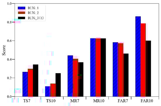 After obtaining the best schemes for the four training experiments, the four schemes were used to forecast eight individual typhoon cases from 2015–2018, and the forecast results were compared. In the process of finding the best scheme for each experiment mentioned above, it was found that the parameters of the best schemes of DLTG_3 and DLTG_4 take similar values, and that the TSsum of the best scheme was the same for both. In the tests with independent samples, DLTG_3 and DLTG_4 demonstrated the same forecast skill, while the results produced by adding the TC translation speed similarity and the new ensemble forecast schemes were the same as those obtained using only the new ensemble forecast schemes without the superimposed improvement effect, which further indicates that the TC translation speed similarity improvement effect cannot be highlighted at this time. For convenient description, the TSs of TC potential maximum gale greater than Beaufort Scale 7 and 10 are denoted TS7 and TS10, respectively. Similarly, the FAR and MR scores of TC potential maximum gale greater than Beaufort Scale 7 and 10 are denoted as FAR7 and FAR10, and as MR7 and MR10, respectively. Above Beaufort Scale 7, the introduction of either the TC translation speed similarity (DLTG_2) or the new ensemble forecast schemes (DLTG_3) can improve the TS of the model (Figure 4), and the improvement of DLTG_3 is greater than that of DLTG_2, i.e., the TS of DLTG_1, DLTG_2, and DLTG_3 is 0.26, 0.3, and 0.34, respectively. This improvement is greater than 31% over the original scheme (DLTG_1). The same comparison results were produced for the case above Beaufort Scale 10. Although the TS decreased in all experiments at Beaufort Scale 10, in comparison with the TS at Beaufort Scale 7, the improvement in the TS for DLTG_3 (0.25) was greater, i.e., an increase of 127% over DLTG_1. This indicates that the DLTG_3 test demonstrated better forecast capability in terms of TC potential maximum gale in more extreme cases. It was also found that the improved model reduced the FAR and MR scores, i.e., the improvement of DLTG_3 (and 4) was greater, where FAR7 and FAR10 were reduced by 0.1214 and 0.2611, respectively, and MR7 was reduced by 0.072. The above analysis indicates that the improved model produces a better forecast and has lower FAR and MR scores as the Beaufort Scale of the TC potential maximum gale increases, reflecting the advantages of the improved model in terms of forecasting TC extreme gales.