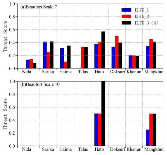 Considering that the TC potential maximum gale of the training samples is concentrated from the Beaufort Scale 6–8 (figure omitted), the TS of the TC potential maximum gale greater than the Beaufort Scale 6 and 8 is denoted as TS6 and TS8, respectively, and the maximum value of their sum (TS6 + TS8; hereafter, TSsum) is used as the selection criterion for the best forecast scheme in their simulation experiment for more effective selection. However, the experiment for independent samples focused on Beaufort Scale 7 and 10 because Beaufort Scale 7 is related to TC scale and Beaufort Scale 10 is a critical reference for TC defense [32]. The meteorological department in China issues early warnings for government guidance and public awareness based on information from observation stations affected by TC gales at thresholds of Beaufort Scale 7 and 10. Additionally, because the forecast performance of the DLTG_1 model (compared with dynamical models such as the CMA, ECMWF, JMA, and NCEP models) has been fully compared and tested by Li et al. [24], and because the independent samples used in this study included two more cases than used in [24], the experiments in this study were conducted to compare the forecast performance of the improved DSAEF_LTG model (i.e., DLTG_2, 3, and 4) with the unimproved model (DLTG_ 1) for comparative assessment of forecasting capability.