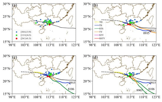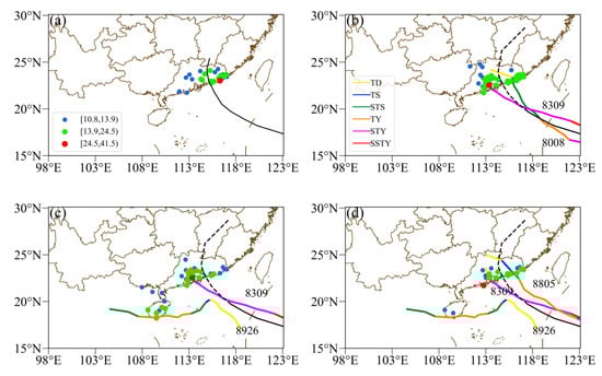 Distribution of potential maximum gale (m/s) during Typhoon Hato according to (a) observations; (b) DLTG_1; (c) DLTG_2; and (d) DLTG_3 (and 4). Black solid line is the observed track, black dashed line is the forecasted track, and colored solid line is the best similar TC track.