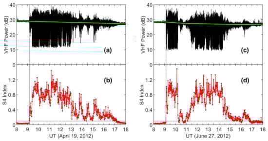 Examples of VHF scintillation over Kwajalein on 19 April and 27 June 2012. (a,b) show the VHF power and the S4 index for the case of 19 April 2012. (c,d) show those for the case of 27 June 2012.