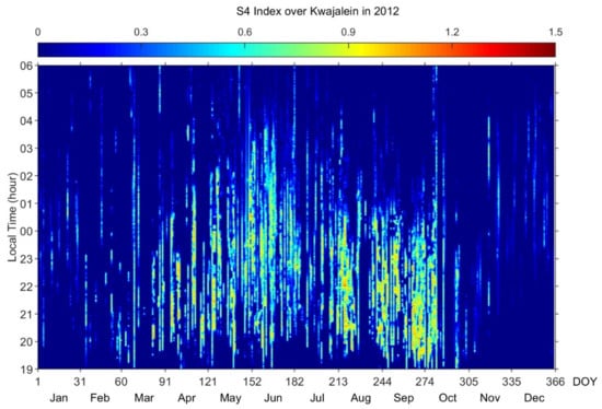 Kwajalein is located at 8.72° N, 167.73° E (3.79° magnetic latitude), an ideal location for studying equatorial scintillation. The signals used in this study were transmitted from a geostationary satellite in the VHF range (about 240 MHz) and received at Kwajalein throughout the entire year of 2012. The data were continuously recorded, without any significant gap. For scintillation studies, we analyzed the data between 08:00 and 20:00 UT, corresponding to 19:00–07:00 LT (LT = UT + 11 h), because equatorial ionospheric scintillation is caused primarily by ESF irregularities associated with plasma bubbles, and occurs exclusively during nighttime.