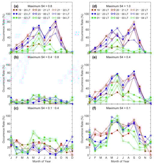 It is necessary to mention that the monthly distribution of scintillation occurrence is very different for S4 (or scintillation intensity, SI) greater than a specific value or in a specific range. As can be seen in Figure 3, the monthly occurrence is similar for S4 > 0.1, 0.4, 0.8, and 1.0. This is because the monthly distribution of scintillation occurrence is dominated by those with large S4 (e.g., S4 > 0.8). If we only look at Figure 3e (S4 > 0.4), it does not show how scintillation activities at different S4 levels contribute to this distribution. In contrast, if we examine Figure 3a,b, it becomes clear that the scintillation activity with S4 > 0.8 determines the peaks in June and September.