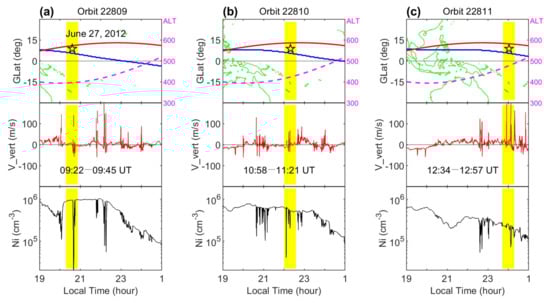 Examples of equatorial ionospheric irregularities measured by the C/NOFS satellite during three consecutive orbits on 27 June 2012. From top to bottom are the C/NOFS orbit, the vertical ion drift, and the ion density, respectively. The star in the top row denotes the location of Kwajalein.