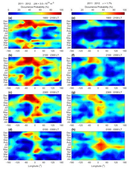 The monthly–longitudinal distribution of the occurrence probability of the ESF irregularities measured by C/NOFS in 2011–2012. ∆N and σ are used to define ESF irregularities in the left and right columns, respectively. (a–d) show the patterns of the occurrence probability with ∆N > 3 × 1010 m−3 in four local time ranges, and (e–h) show the patterns of the occurrence probability with σ > 1.7%.