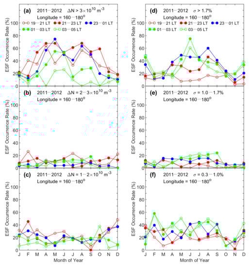 There is no generally accepted definition of how large σ must be for the occurrence of plasma irregularities. Criteria of σ > 0.3%, 0.5%, 1%, and 5% have been used in different studies [,,,,,]. Ref. [] examined the occurrence of ESF irregularities at different levels of ∆N and found that the global distribution of ESF occurrence with ∆N > 1 × 1010 m−3 is quite different from that with ∆N > 2 × 1010 m−3. Obviously, a higher σ or ∆N threshold for ESF will result in a lower occurrence rate.