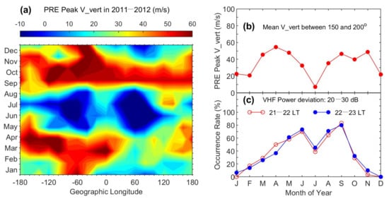 It is well understood that plasma bubbles result from the nonlinear evolution of the Rayleigh–Taylor instability []. The vertical plasma drift at the PRE is the controlling factor for the generation of plasma bubbles [,,]. We use the vertical ion drift data obtained when C/NOFS was located within ±5° from the magnetic equator in the interval of 1800–1900 LT and the altitude of C/NOFS was lower than 500 km at 1900 LT during the two years of 2011–2012. Figure 7a shows the monthly longitudinal distribution of the PRE peak (or the maximum ion drift between 1800 and 1900 LT). The prominent features in Figure 7a are the minima around ±60° in May–August and the maxima in Equinoxes. However, the PRE peak drift during June solstice became relatively large in the Pacific sector. We are interested in comparing the PRE drift with the scintillation occurrence over Kwajalein. Thus, we selected the PRE peak drift data in the longitudinal range of 150°–200°, and the average values of the drifts are plotted in Figure 7b. The monthly averaged drifts are large during March–June and September–December but become small in July. The monthly variation of the PRE drift is similar to the variation of the scintillation occurrence probability over Kwajalein (Figure 7c). Note that the PRE drifts in Figure 7b are derived over a longitudinal range of 50° (from 150°–200°) from two years (2011–2012) but not exactly over Kwajalein, which may result in the subtle differences between Figure 7b,c. The general agreement between the PRE drift and the scintillation occurrence provides further evidence that the enhanced PRE drift causes the generation of ionospheric irregularities through plasma bubbles, leading to the occurrence of enhanced scintillation activity. The agreement in the monthly variation of the PRE drift and the scintillation occurrence over Kwajalein is identified for the first time.