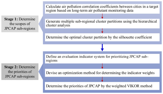 As previously stated, the implementation and optimization of JPCAP for a specific region is critical for controlling air pollution. In this paper, we propose a new two-stage hybrid model for determining the scopes and priorities of JPCAP sub-regions, laying the groundwork for effective regional joint air pollution control. In particular, in the first stage, we propose a method for determining the scope of the joint action based on regional long-term pollution monitoring data. In the second stage, we first identify the key elements of regional joint air pollution control and define an evaluation indicator system for joint action priorities. Then we propose a method for prioritizing JPCAP sub-regions based on the multi-attribute comprehensive evaluation theory. Figure 1 depicts the process of the proposed two-stage hybrid model for determining the scopes and priorities of air pollution control, which is detailed below.