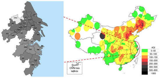 Locations of the 27 cities in the YRD region (left) and Air Quality Index (AQI) map of China on 18 November 2020 (right).