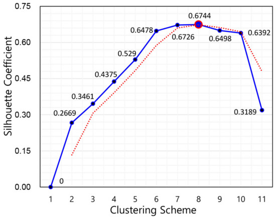 Silhouette coefficient values (blue line) and trend curve (red line) for the 11 cluster partitions revealed by the dendrogram in Figure 3.