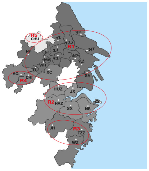 In addition to forming mathematical clusters (as shown in Figure 5), the cities in each cluster also form physically contiguous territories, as seen in Figure 6. We use ArcGIS software (http://www.arcgis.com, accessed on 1 February 2022) to produce an initial draft of the map, which was subsequently refined to create the final version depicted in Figure 6. It would be difficult for cities separated by a large geographical distance to collaborate in JPCAP implementation. To some extent, this indicates that our JPCAP region division is practical. SH, NJ, WX, CZJ, SZ, NT, YZ, ZJ, YC, TZJ, HF, WH, MA, and TL are grouped into R1. There are no significant geographical barriers between these cities. Furthermore, the cities in R1 have a highly mobile population that travels between these cities. HAZ, NB, HUZ, JX, SX, and ZS in R2, are also physically close and have a similar industrial structure, such as e-commerce industry, textile industry, and light manufacturing, etc. There are evident geographical barriers between sub-regions R1 and R4, as well as between sub-regions R2 and R3, such as mountains (Jingting Mountain, Tiantai Mountain) and huge water body (Taihu Lake). CHU alone forms a distinct sub-region R5 located in the northwest corner of the study region, separated from the rest by high mountains (Langya and Ta-pieh Mountains). High mountains prevent the diffusion of air pollutants and Large area water bodies reduce the diffusion impact, which should be the main reasons for the low Pearson coefficient of air pollution between sub-regions.