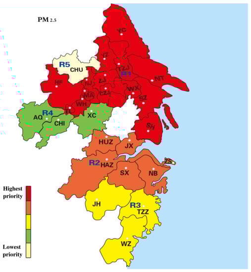 The proposed weighted VIKOR method was then utilized to calculate the priorities of the five JPCAP sub-regions in the YRD region. Table 4 presents the resulting outcomes. Figure 7 clearly shows that R1 > R3 > R2 > R4 > R5. Sub-region R1, which includes SH, NJ, WX, CZJ, SZ, NT, YZ, ZJ, YC, TZJ, HF, WH, MA, and TL, should control and prevent PM2.5 most urgently. The priority is the lowest for R5.