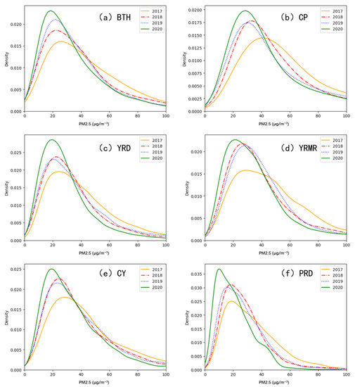 Kernel Density Estimation of Annual Average PM2.5 Concentration in China’s Six Major Urban Agglomerations: (a) BTH-UA, (b) CP-UA, (c) YRD-UA, (d) YRMR-UA, (e) CY-UA, (f) PRD-UA.