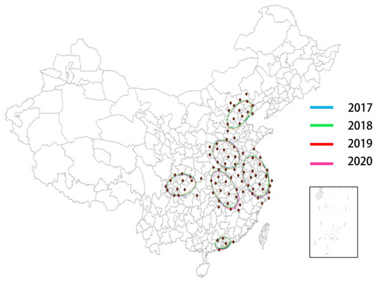 - Shen, Y.; Zhang, L.; Fang, X.; Ji, H.; Li, X.; Zhao, Z. Spatiotemporal Patterns of Recent PM2.5 Concentrations over Typical Urban Agglomerations in China. Sci. Total Environ. 2019, 655, 13–26. [Google Scholar] [CrossRef] [PubMed]