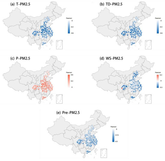 In this study, the Pearson correlation coefficients between the daily average PM2.5 concentration and the five meteorological factors in each city are calculated to assess the impact of each meteorological factor on PM2.5 concentration. The coefficient ranges from −1 to 1, with values from 0 to 1 indicating a positive correlation between PM2.5 concentration and meteorological factors, which contribute to the accumulation of PM2.5; values from −1 to 0 indicate a negative correlation, with meteorological factors contributing to the removal of PM2.5, and a value of 0 indicating that the meteorological factor does not affect PM2.5.