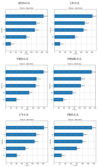 As shown in Figure 6e, precipitation is negatively correlated with PM2.5 concentration, and the higher the latitude, the stronger the negative correlation. The negative correlation becomes more obvious from north to south. CY-UA, PRD-UA, and the southern part of YRMR-UA all show higher negative correlation. Precipitation is also the main meteorological influence in most coastal areas [17], and the influence in coastal cities of YRD-UA and PRD-UA is more obvious than in inland cities.