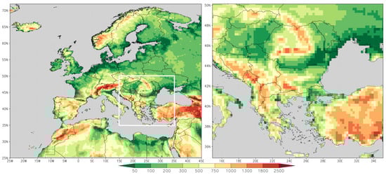 The study area is the same as in [47]—with geographical boundaries of 35° N–50° N and 15° E–35° E. The elevation data from the daily gridded dataset E-OBS at 0.25° resolution is used to present the topography of the domain (Figure 1).
