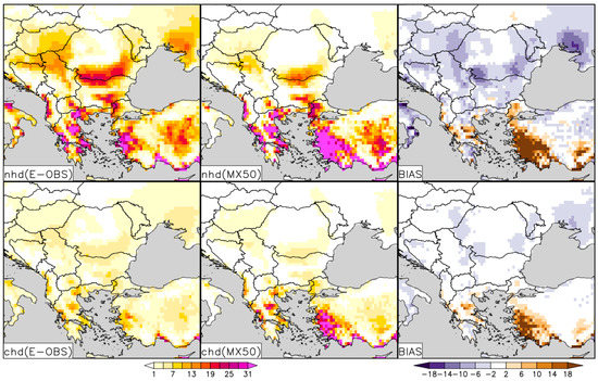 Comparison of multiyear mean values (1950–2005) of NEX-GDDP MME MX50 and E-OBS for nhd and chd, as well as the absolute bias (model-reference). The units are days.