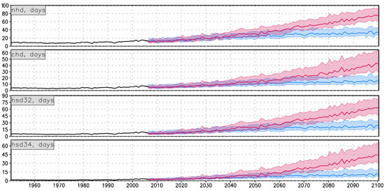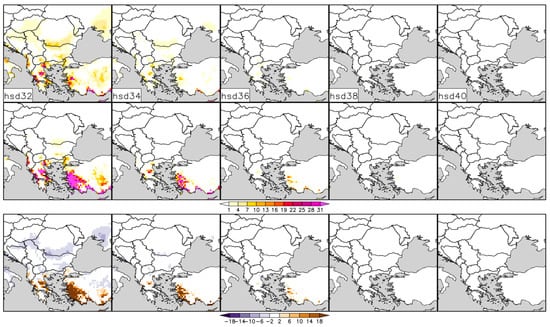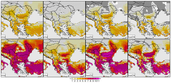 The overall impression of these two figures is their consistency with Figure 6 and Figure 7. Consequently, the outdrawn general conclusions for nhd and chd are also valid for the hsd. As expected, the values of hsd for all thresholds are higher for the scenario with the stronger forcing. The comparison of Figure 8 and Figure 9 with Figure 3 reveals that hsd36/38/40 in the historical period hardly exists. By contrast, for the scenario RCP8.5 in the period of 2071–2100, there is a significant increase in hsd32/34, indicating the direct effect of regional warming in a scenario of comparatively high greenhouse gas emissions [70,72]. The projected long-term means of hsd38/40 would remain close to zero over the bigger part of the domain even by these conditions.
