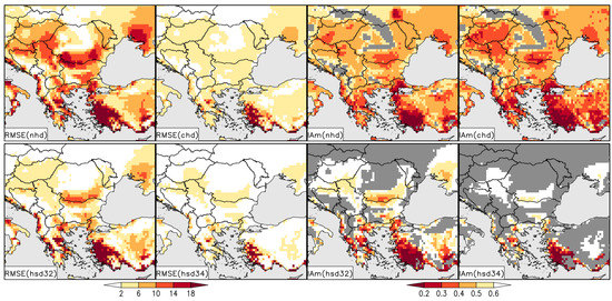 Regarding RMSE values, nhd distinguishes with the largest spatial heterogeneity, with a mean value below 10 days. The RMSE fields for the other indicators are more homogeneous, with a mean value around or below 6 days. The spatial patterns of IAm for nhd and chd are similar, with prevailing values in the range of 0.3–0.5. The IAm values for hsd32 and hsd34, where they are defined, ranged from below 0.2 (over southwestern Türkiye) to above 0.6, mainly in the northern part of the domain.