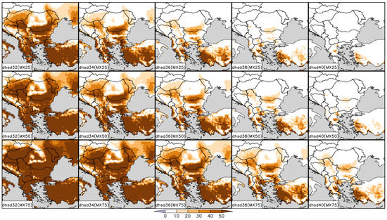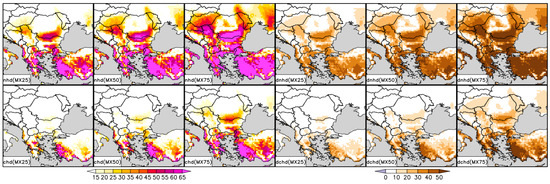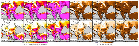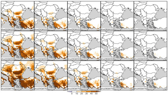 Figure 10 and Figure 11 show differences between the multiyear means of MME MX25, MX50, MX75 of hsd32/34/36/38/40 for 2071–2100 under RCP4.5 and RCP8.5 in respect to the MX50 of the 1976–2005 period.