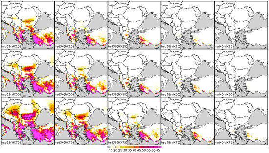 Figure 8 and Figure 9 show the multiyear mean values of MME MX25, MX50, and MX75 of hsd32/34/36/38/40 for 2071–2100 under both scenarios.