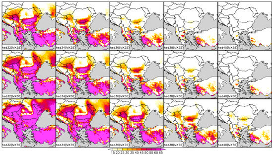 Figure 10 reveals that under RCP4.5, the MX50 of the indicator hsd32 could increase with more than a month over significant parts of Türkiye, Greece, Bulgaria, and the West Balkans. For RCP8.5, (Figure 11) this increase is over 50 days, practically over the whole domain, except for the mountains mainly in Bulgaria (Rila Mountain), the main Carpathian ridge in Romainia and the Dinaric Alps in Croatia and Bosnia and Herzegovina as well as a relatively small area in Slovakia and Poland, close to the northern border. Hence, under RCP4.5 and especially RCP8.5, hsd34 and hsd36 could become meaningful metrics of extreme heat over significant parts of the domain.