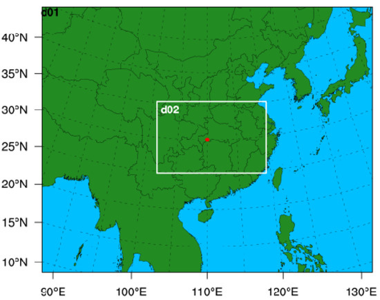 Geographical domain used in the WRF model runs. The solid red circle indicates the central point of the outer domain.