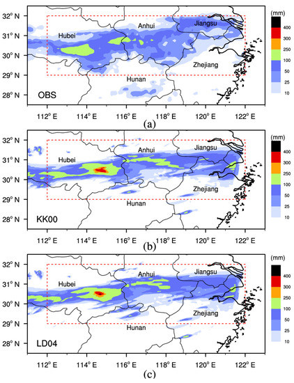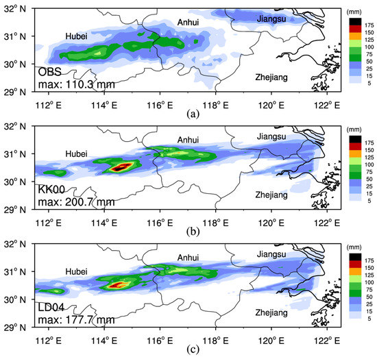 Distribution of the 24 h accumulated surface rainfall from 1200 UTC on 4 July 2020 to 1200 UTC on 5 July 2020 in the (a) observation, (b) KK00 simulation, (c) LD04 simulation.