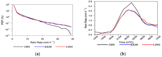 Figure 3 describes the probability distribution of the rain rate (RR) and the temporal evolution of the regionally averaged RR in the main rainfall region (29–32° N, 112–122° E) where the 24 h rainfall is great at approximately 10 mm and the regionally averaged values are computed in this region throughout this article. When the RR is below 18 mm h−1, both simulations slightly underestimate the RR and the LD04 simulation better matches the observations. However, when RR exceeds 18 mm h−1, both simulations overestimate the RR. It is notable that the rain magnitude still differs between the simulations. The temporal evolutions show that the observational RR strengthens from 1800 UTC on 4 July and then weakens after reaching its peak at 0200 UTC on 5 July. Results from the two simulations are similar to the observations; however, the results of the LD04 run are stronger than those of KK00 during most periods, especially in the weakening period after 0600 UTC on 5 July.