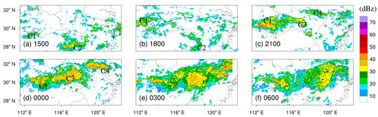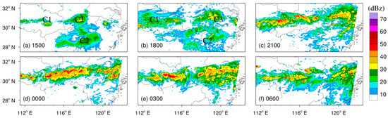 To help understand the life cycle of Meiyu front rainfall, Figure 4 shows the time sequence of the observed radar composite reflectivity distribution. At 1500 UTC on 4 July 2020, some echoes were spun up in northeastern Hubei and northeastern Hunan (marked as C1 and C2, respectively). The C1 echoes gradually gained strength but the C2 echoes weakened at 1800 UTC. Subsequently, some new convective echoes developed in southwestern Anhui and along the boundary between Anhui and Jiangsu (C3 and C4, respectively) at 2100 UTC. The three convective echoes (C1, C3, and C4) continued to strengthen and then organize in a quasi-linear fashion from 0000 to 0300 UTC on 5 July 2020. After that, the Meiyu frontal system gradually weakened.