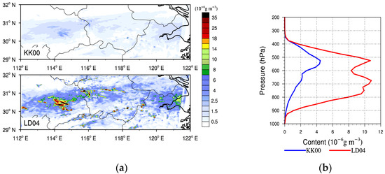 The horizontal and vertical structures of the content of autoconversion are shown in Figure 6. Figure 6a shows that the distributions of the autoconversion content and precipitation are consistent (Figure 2), particularly in the area of maximum value. Obviously, the autoconversion content in the LD04 simulation is significantly larger than that in KK00, which indicates that more cloud droplets convert to raindrops in the LD04 parameterization.
